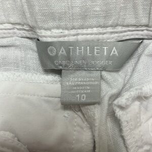 Breezy and stylish Athleta Cabo Jogger pants in crisp white linen. Features a relaxed fit, elastic drawstring waist, and tapered ankle for an effortlessly polished look. Lightweight, breathable, and perfect for warm weather or travel. Excellent used condition. Size 10.