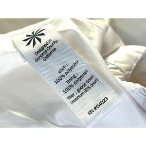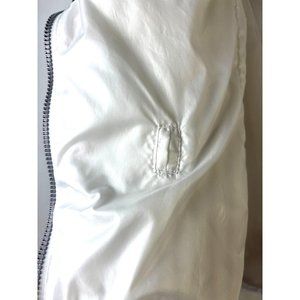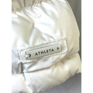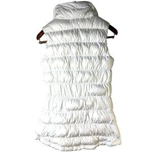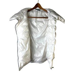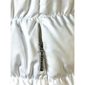 This Athleta White Puffy Vest in women's extra small size offers a touch of warmth and style. It features a full zip, side pockets, goose down filling, and an asymmetrical collar. Solid white in color and comes with an interior key pocket.