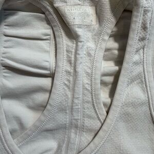 Classic white racerback tank with front ruched detailing. Lightweight, breathable fabric designed for everyday wear. Flattering fitted silhouette that layers easily. White color adds a clean, versatile look.