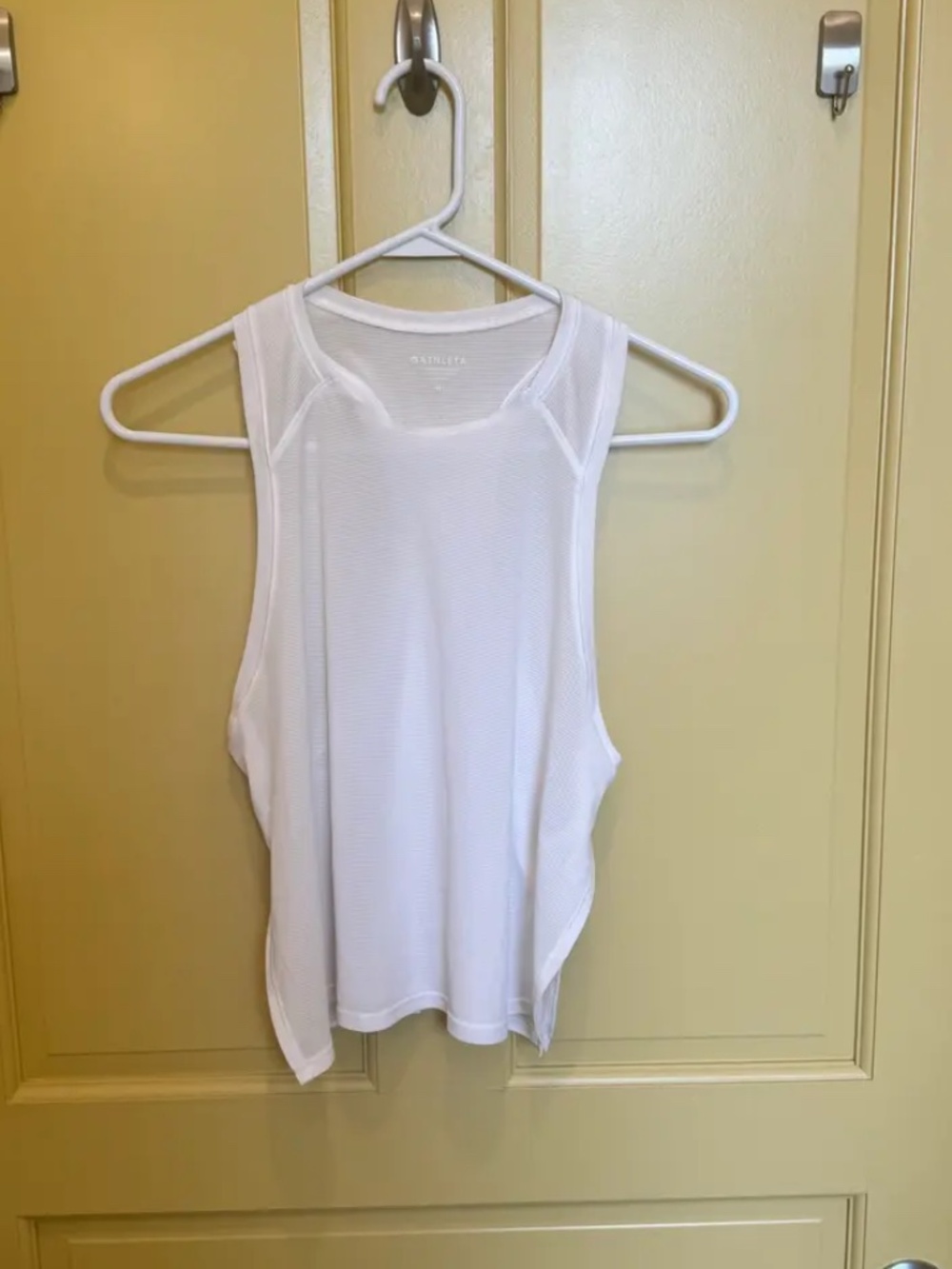 Athleta large white ribbed workout tank with a racerback design and relaxed, flowy fit. Features a scoop neckline, lightweight performance fabric, deep arm openings, and a subtle Athleta logo near the hem.