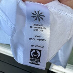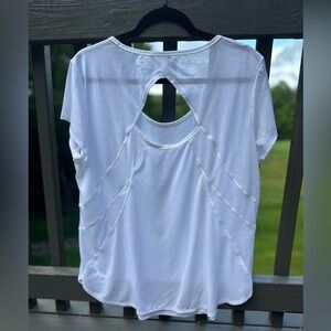 This Athleta t-shirt features a crisp white color and short sleeves, perfect for a casual day out. The standout cutout detail on the back adds a touch of style to this comfortable and relaxed fit top. Made from a soft, stretchy fabric, it ensures all-day comfort.