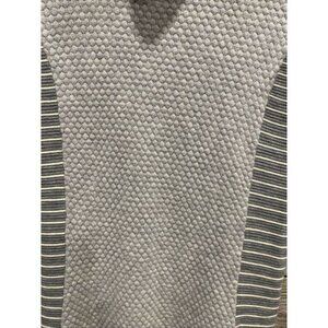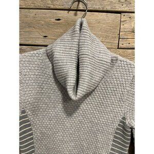 This Athleta sweater dress is perfect for any casual or travel occasion. Made with a wool blend and extra fine merino wool, it is a knee-length dress with a turtleneck and 3/4 sleeves. The dress features a fit and flare, A-line, blouson, and bodycon style, all in a beautiful gray color.