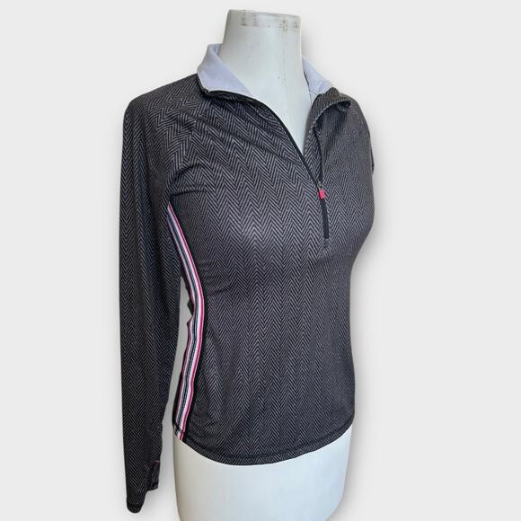 Super cute Athleta women's quarter zip athletic pullover in a cute gray herringbone patter with black, white, and pink stripes down the sides. This pullover is in excellent preowned condition. Size Small.