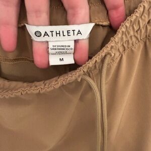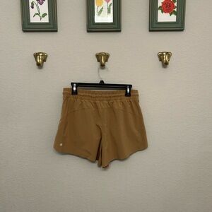 Comfortable tan athletic shorts by Athleta. Ideal for workouts and casual wear.