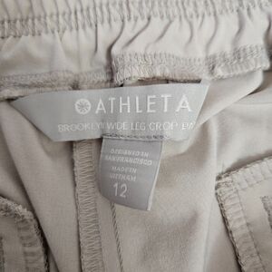 EUC Size 12 Athleta Women's Brooklynn Wide leg crop pant in ivory/cream/bone color. Soft poly/spandex stretch material with pockets. Measurements as shown in photos.