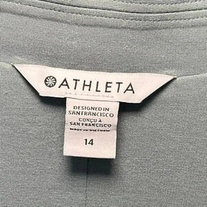 Athleta Eastbound Blazer size 14. Open front, soft stretch ponte fabric. Patch pockets and a notched collar. Relaxed fit in a beautiful gray- green color. Excellent condition! 77% lyocell, 20% nylon and 3% spandex. Measurements: length- 28 inches and sleeve length ( from shoulder seam to cuff)- 24 inches