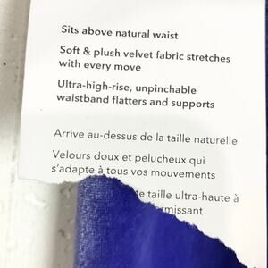 Features: 25" waist, 31.5" inseam, 11" rise, polyester/spandex blend, sits above natural waist, stretchy velvet fabric.