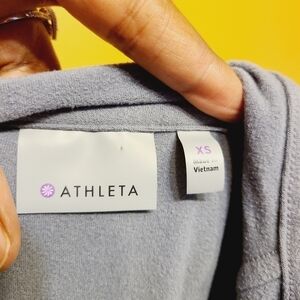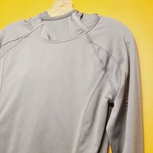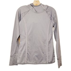 Women's gray plush tech running hoodie, by Athleta, size XS. Fabric: 92% polyester and 8% spandex. Pullover style with thumb holes. Lined. Excellent pre-owned condition; no flaws.