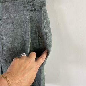 Like new. 100% linen. Heathered green/gray. Non-stretch. Breathable. Partial elastic waist. Adjustable waist. Four-pocket design. Front pockets snap close. Button/hook & eye/zipper front closures.