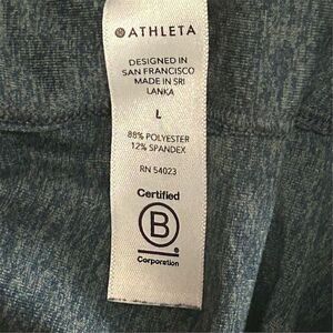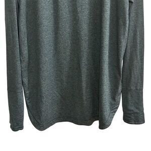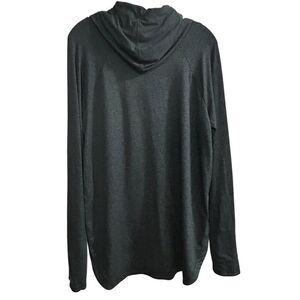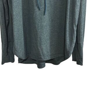 This Athleta hoodie is a women's large, regular size sweatshirt in a solid Green color. It features a cowl neck and long sleeves, with a relaxed fit ideal for casual or workout activities. Made from a blend of polyester and spandex, it is machine washable and suitable for fall. The hoodie has a drawstring closure and is manufactured in Sri Lanka. The chest size measures 24 inches. This pre-owned item is in excellent condition.