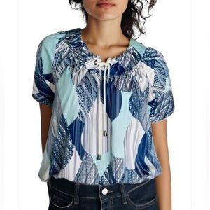 White & navy blue striped, cinched sides for fitted look, faux wrap front, mini length skirt.