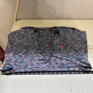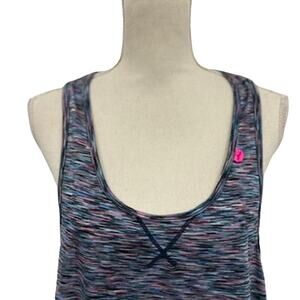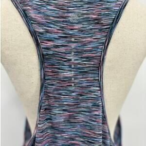 This Athleta multicolor racerback tank top is ideal for gym and activewear enthusiasts. Designed with reflective dots and a comfortable racerback style, it's perfect for workouts or casual wear. The vibrant multicolor pattern includes shades of blue, pink, and purple, adding a stylish touch to your athletic wardrobe. Size M.