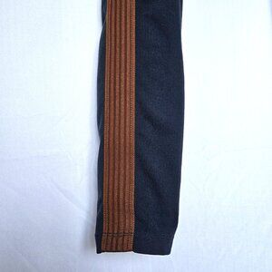 ATHLETA Navy Blue Athletic Leggings with a Rust Stripe Accent and 2 Functional Back Zippered Pockets.