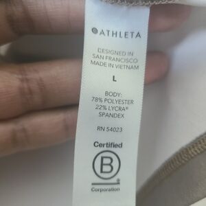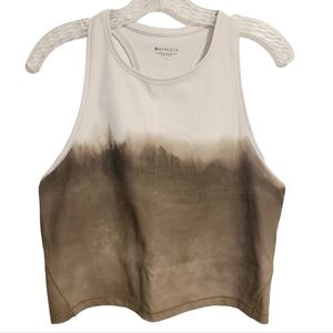 Women's ombre shanti watercolor stripe cropped fitted tank top by Athleta, size small. Mortar Mushroom color; mix of brown, tan and white. Wear it more, wash it less. Machine wash and dry. Polyester and lycra spandex fabric blend. Fitted next to the body. Wicking; pulls sweat away from the body to the surface of the fabric so it can evaporate. Excellent pre-owned condition; no flaws.