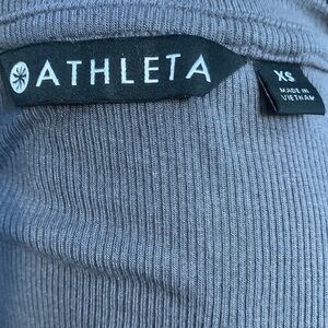 Athleta Women’s Short Sleeve Scoop Neck Ribbed T-Shirt XS. Great preowned condition. With the exception of light discolored line across the back. Approximate measurements armpit to armpit 17 1/2 inches length 27 1/2 inches. Kind of a light plum gray color.