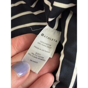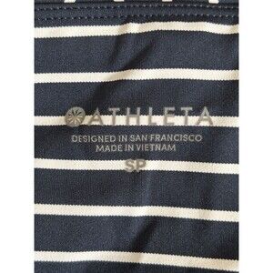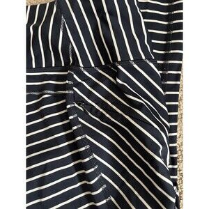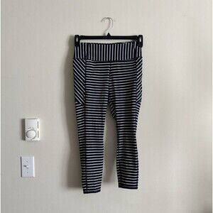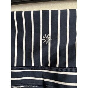 Comfortable, stretchy Athleta capri leggings. Great for spring, summer, and year round indoor workouts! Navy blue and white striped design with convenient, zippered pockets. Securely hold all of your necessary belongings! Lightweight.