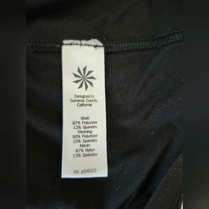 Polyester and spandex blend, lightweight, mesh panels at arms and back, great for yoga or any workout, PTP 18"