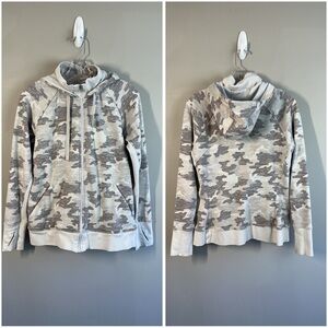 Athleta Womens Triumph Printed Hoodie in Grey Gypsum Camo Size Large Thumb Holes