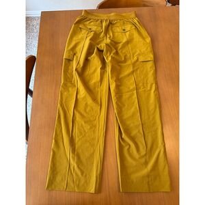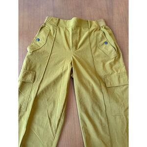 Commanding attention with a relaxed yet refined aesthetic, these Athleta cargo pants embody casual sophistication. Boasting a comfortable elastic waistband, these pants promise all-day ease without compromising on style. Flattering wide legs flow effortlessly, while thoughtfully placed cargo pockets add a touch of utilitarian chic. The golden-olive hue radiates warmth and versatility, making these pants a standout piece in any wardrobe. Decorative snap closures accent the front and back pockets. Ideal for weekend adventures, stylish travel, or simply elevating everyday errands, these pants effortlessly combine fashion and function.