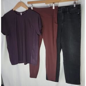 Athleta- Women's 3 piece bundle- Dark purple short sleeve shirt, Maroon leggings, and Black jeans. Shirt and Leggings size medium. Jeans size 6- all in good used condition