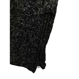 Gently pre-owned Athleta long sleeve sweater in black and white. Older Athleta label. Tunic length v-neck sweater with asymmetrical bottom hem. Fitted sleeves, slightly relaxed through body. Side zipper on 1 side. Chunky cable tight knit made of wool and cashmere in a marled black and white. In good used condition, some wear including rub wear and minor pilling.