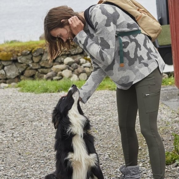 This camo sweater from Athleta is a nice blend of nylon, Alpaca, and fine merino wool which makes this so soft and super warm. Great for hiking or running errands. No flaws.