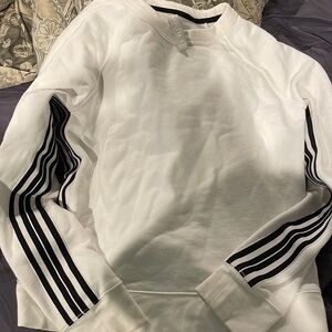 Sporty White Sweatshirt with Side Stripes. This casual white sweatshirt features a classic crew neckline and a sporty design with two black stripes running down the length of each sleeve. The ribbed cuffs and hem add a traditional sweatshirt finish. It's a comfortable and stylish piece, perfect for lounging, athleisure, or adding a classic athletic-inspired touch to your everyday outfits.