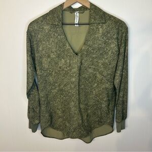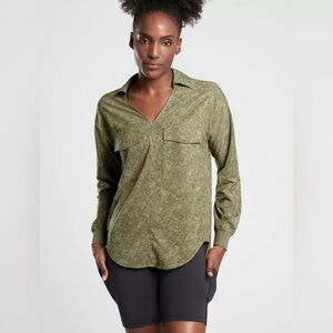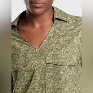 Athleta Zuma Printed Top in Viper Shadow Olive Green, Size XS, Collared V Neck