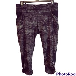 Athleta athletic cropped jogger leggings size medium black and gray ruched leg bottom reflective pockets waist pocket 16" (32") Waist 9" Rise 17.5" inseam Excellent pre-owned condition 8.5 oz