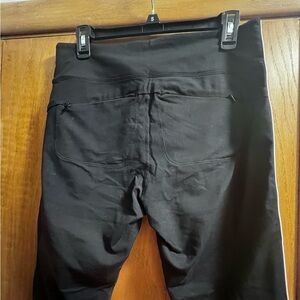 Black Athleta leggings with striped sides and two functional zipper pockets.