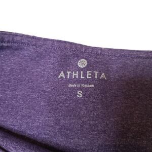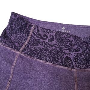 EUC Athleta crop legging. Purple with black pattern panels. Only flaw is that the Athleta symbol is wearing off on the back, shown in photos.