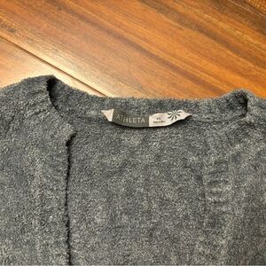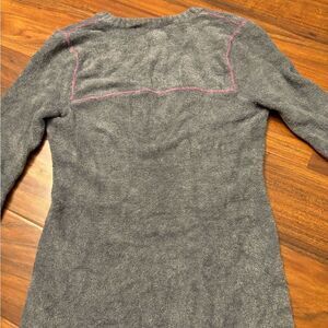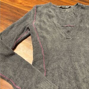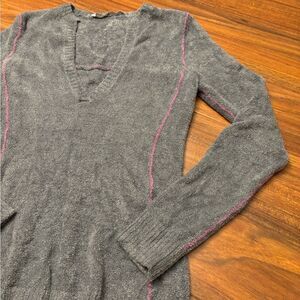 Athleta grey super soft v neck sweater. Pink stitching. Armpit to armpit 15 1/2 inches. Length 23 1/2 inches. 100% nylon. Size XS. Good condition!