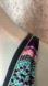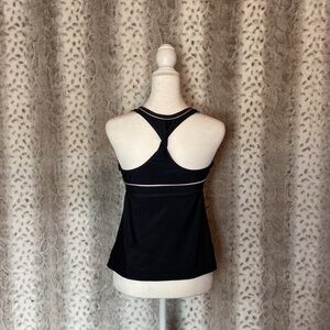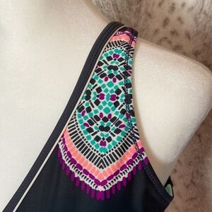 This Athleta swim tank is a deep gray with white piping details. A bright boho design may be seen toward the shoulders in shades of white, purple, green, pink, and turquoise. This tank is gently worn and is in very good condition - minor signs of wear (see pics).