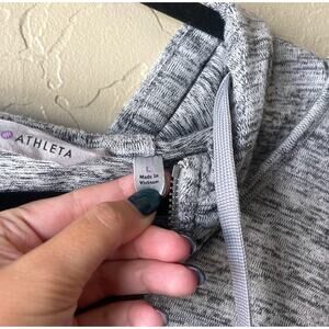 A versatile Athleta Interval jacket in a heather gray. This full-zip jacket is crafted from PowerMove fabric, offering sleek, compressive support. It features thumbholes, zippered pockets, and a flattering fitted silhouette, making it an ideal layer for workouts or everyday wear.
