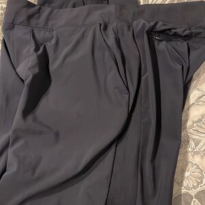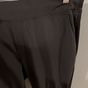 Sleek Black Athletic Pants with Ribbed Detail. These versatile black athletic pants feature a comfortable, possibly stretchable fabric and a slim or tapered fit. They have an elasticized or flat waistband and a distinctive ribbed panel running down the side of each leg, adding both style and flexibility. Side pockets offer practicality. Perfect for workouts, casual wear, or a sporty-chic look!