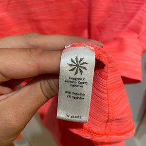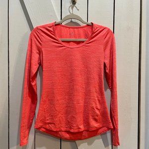 Athleta orange long sleeve top, fitted with a flared bottom, heathered print all over with thumb holes. Size small, gently used with no flaws.