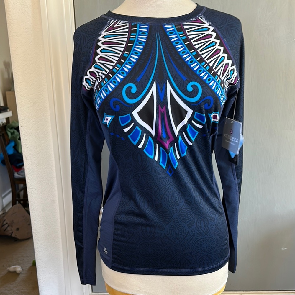 Discover the Athleta Blue Fitted Graphic Long Sleeve rashguard , designed with a striking geometric pattern in turquoise and white. This top combines style and comfort, featuring a fitted silhouette and a crew neckline. The bold design on the front adds a unique touch to your wardrobe. Made of 87% polyester 13% like wrist spandex.