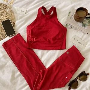 Athleta Red PowerSoft Ruched Crop Tank Top & High-Waisted Salutation Leggings Set in excellent pre-owned condition with original tags. This vibrant red workout set is perfect for yoga, gym, or everyday wear. The PowerSoft fabric offers light compression and a buttery soft feel. The crop tank features a stylish ruched detail and high neck, while the Salutation leggings provide ultimate comfort and support with their high-waisted design and side pockets. This set is a versatile addition to any active wardrobe.