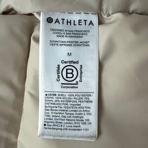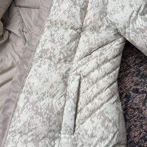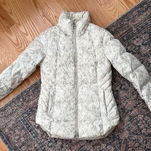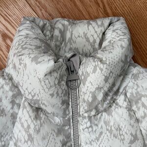 Lightweight printed puffer with a high collar and full zip. Soft neutral print for subtle texture. Packable design for easy travel and layering. Versatile, polished look that pairs with casual or activewear.