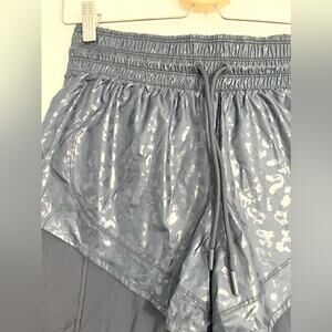 Athleta rainier blue 2 in 1 tights. Layered shorts over tights. Shorts have a subtle animal print pattern. Elastic waist with drawstring. Approx 14.5 inches at the waist laying flat, 28 inch inseam. No flaws to note.