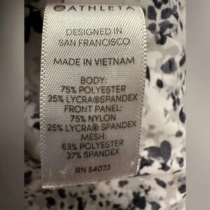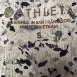 Athleta splatter paint print leggings. Grey and black pattern with grey mesh on legs. Size small.