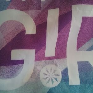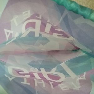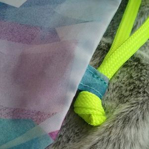 Athleta backpack with Athleta Girl on both sides. Sack part is pastel blue, turquoise, and lilac on a white base that's translucent. See photos where the string and sunlight can be seen through the bag. The thick "shoestring" cords are neon yellow.