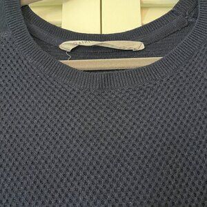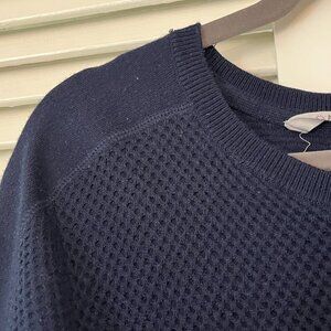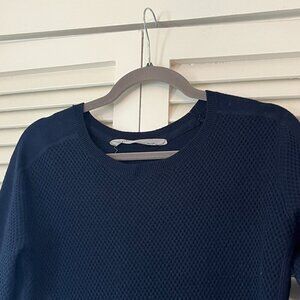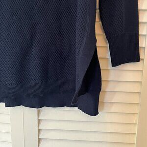 Athleta tunic top sweater, women's size small. Navy with a thermal-style knit design. Notches at hem on sides. Gently worn, in very good used condition. A few loose threads/minor pilling/minor signs of wear. Missing care tag. See photos.