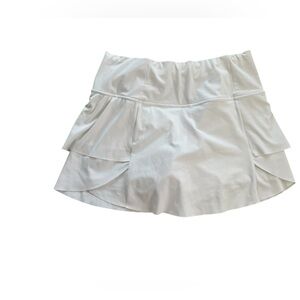 In great condition, features feminine ruffles, built in shorts, ball pocket on shorts and back waist zipper pocket Fits true to size
