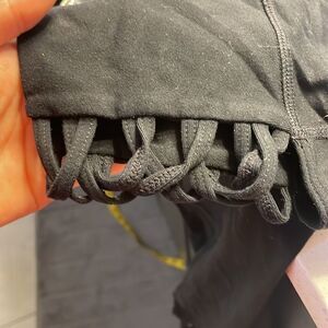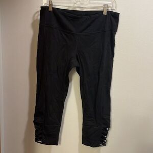 Athleta woman’s black Capri leggings. They have a little woven design on the end of the leggings. The leggings are super cute and in good condition.