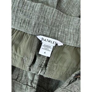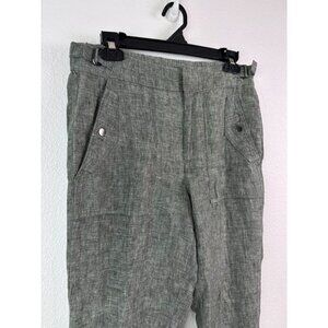 Athleta brand women's size 6 aspen olive green Voyager tapered leg linen pants. In excellent pre-owned condition, little to no wear. Lightweight subtly woven material. Has fabric straps on the waist for adjustably. Relaxed fit and machine washable. 100% linen.