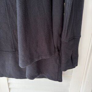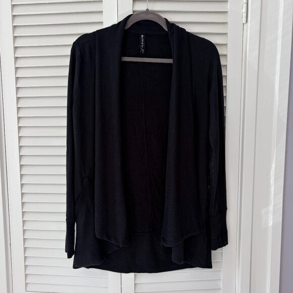 Athleta women's Pranayama Wrap open cardigan athleisure sweater, size XS. Black. Very soft. Ribbed trim at neck and down front. Long sleeves have thumb holes. Gently worn, in very good used condition. Minor wear such as lint. Missing care tag.