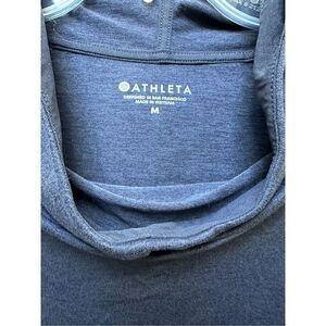 Athleta women’s hooded blue sweatshirt with thumbholes & funnel neck, size Medium 19” underarm to underarm 26” front length 28” back length Note: Missing the hood string but is cute without