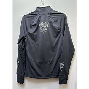 Athleta women’s dark gray athletic sweatshirt with reflective designs on sleeves and back, size Large,