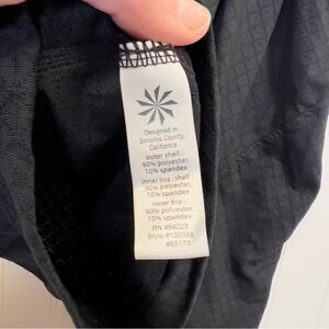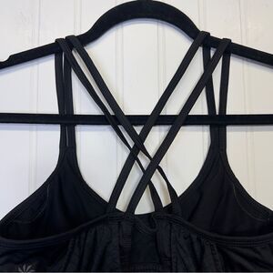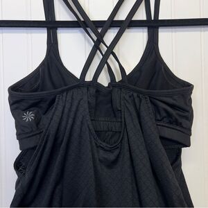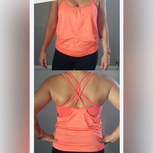 This 2 in 1 tank top is in wonderful shape. It has a built in bra that is exposed with this tank top. The bottom of the tank is a bit more fitted so it does not ride up during your daily activities in it.